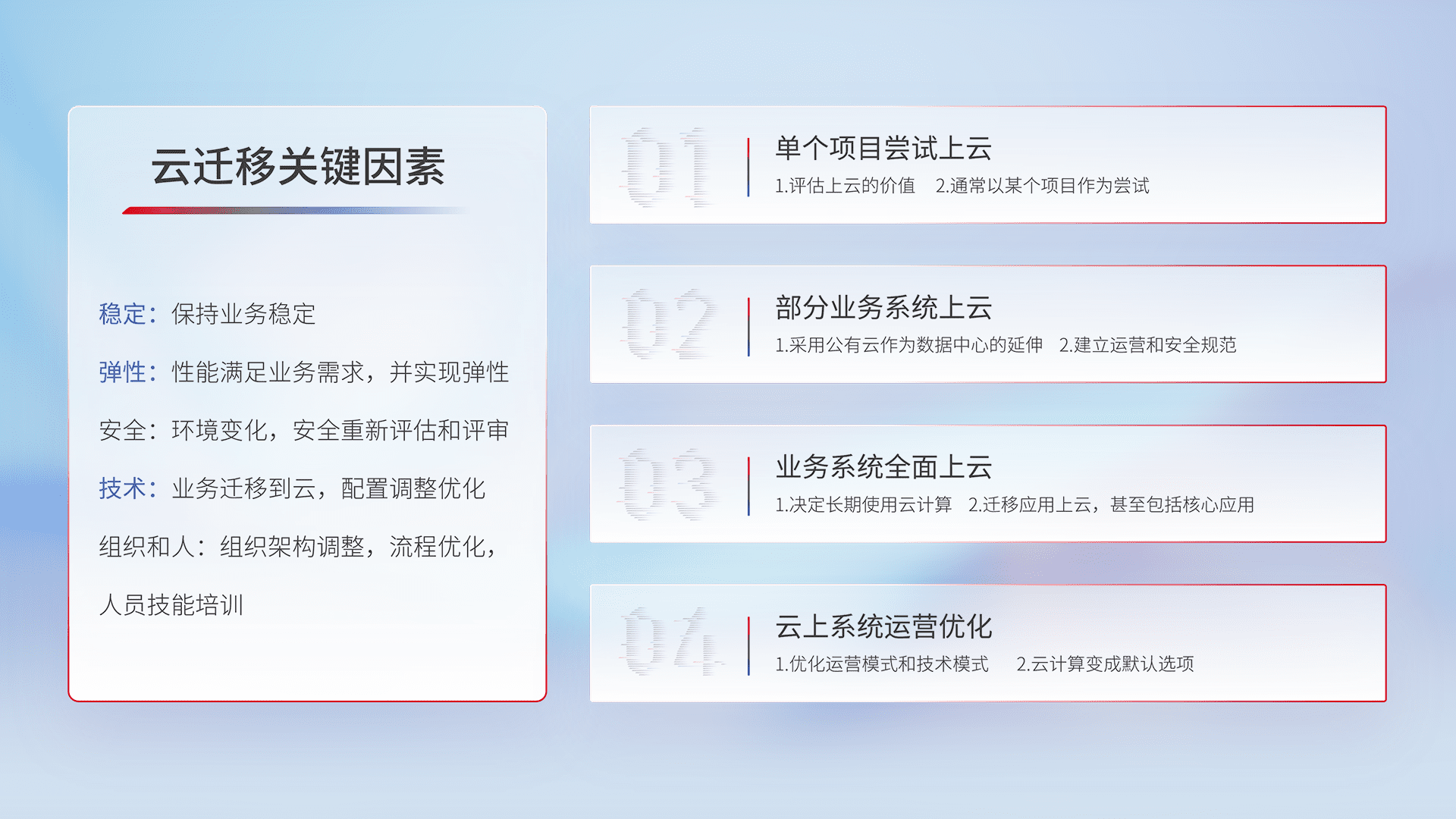 结合实际业务,,,从规划设计、、、、云平台选型、、、、云原生改造、、、、数据迁移、、、集成交付,,,,迁移全过程为客户识别最佳上云路径,,,,做好风险识别管理,,设计网络架构、、、身份权限、、、安全审计合规、、操作审计、、、日志审计、、、、监控告警策略、、、多站点容灾设计等,,对云上基础设施进行整体规划,,,,提升IT治理水平,,,,以满足弹性、、、、高可用、、、、高性能的需求。。。。