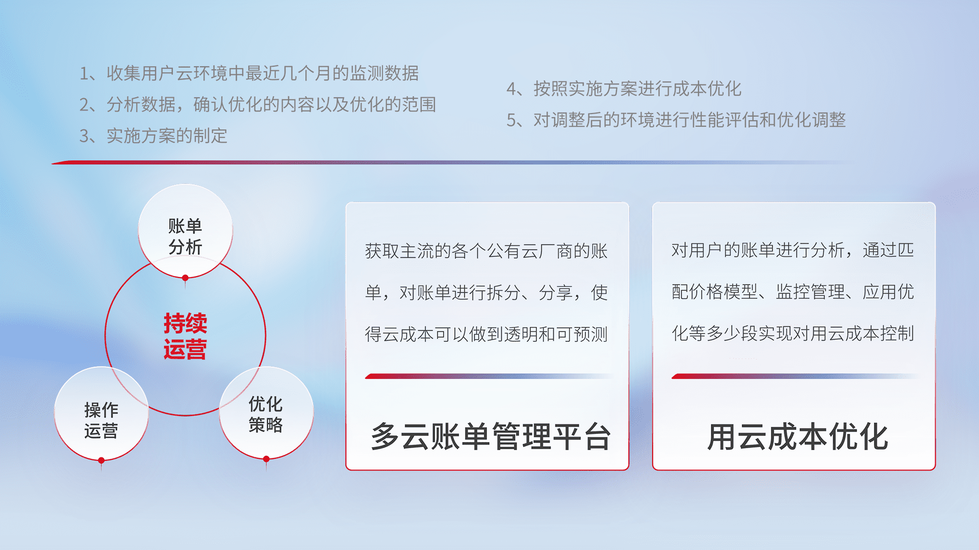 通过多云纳管,,,,以统一的资源数据模型把客户的云资源进行抽象和封装,,进而实现对多云资源的统一操作,,,保障云资源管理的可靠性、、、稳定性与可用性。。。量身定制化运维内容,,配置、、、、开发运维、、、、补丁管理、、、备份、、、监控、、、、认证和访问管理、、、、审计和日常巡检等,,,保障在用云过程中的可靠度,,,稳定度以及高可用率。。