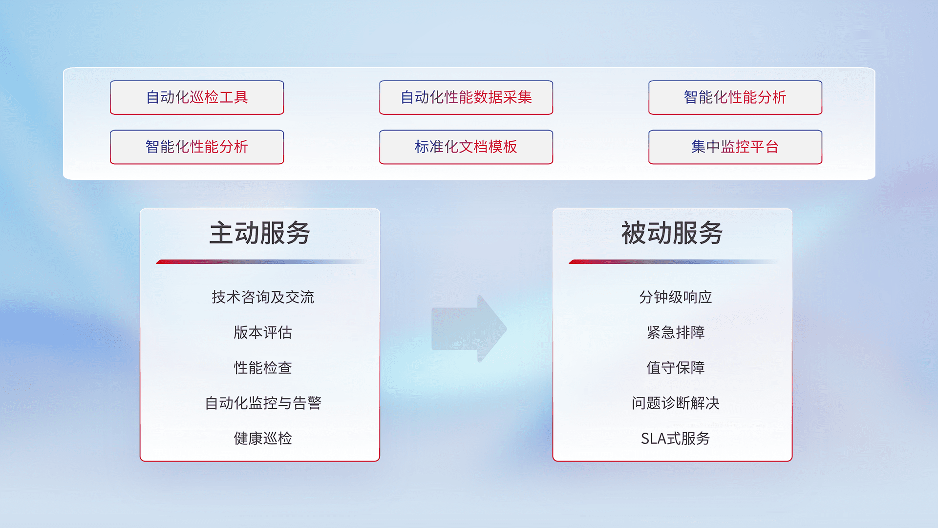智能化工具和标准化文档,,,,保障服务质量,,,,提供主动服务(包含技术咨询、、版本评估、、、性能检查、、、自动化监控与告警、、健康巡检)和被动服务包含(分钟级响应、、、、紧急排障、、、、值守保障、、、、问题诊断解决、、SLA服务)。。。